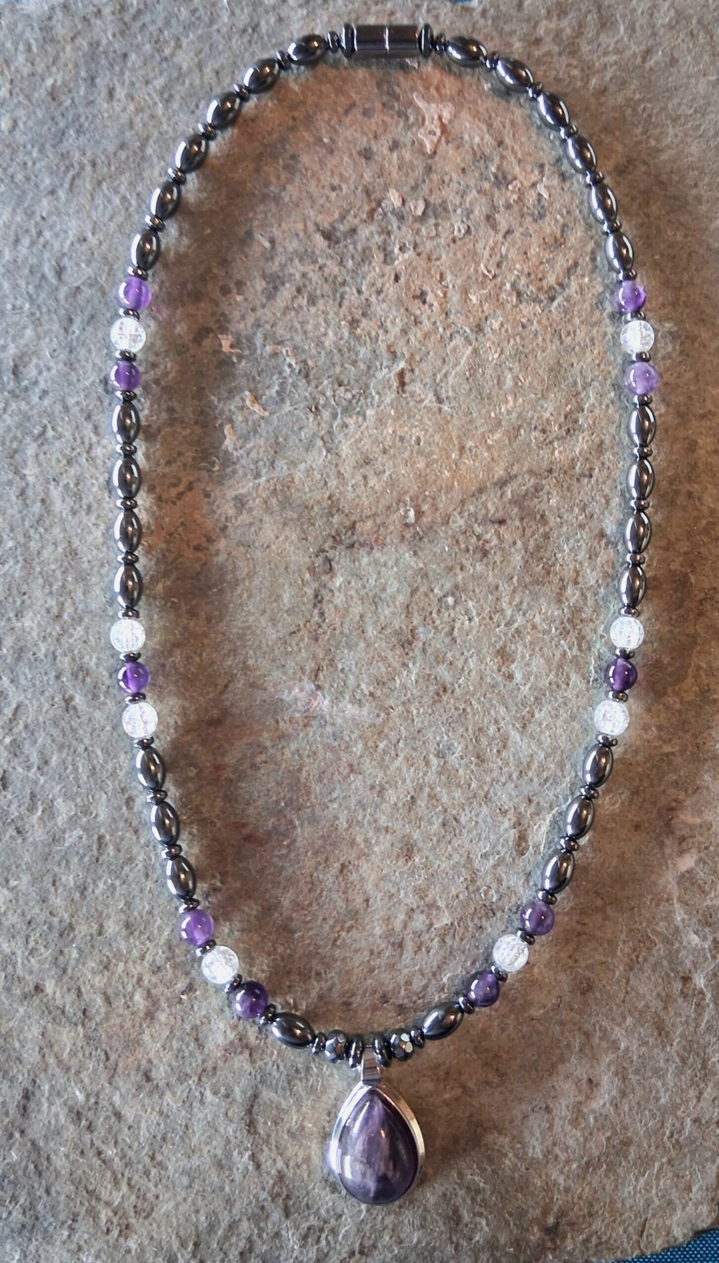 Strong magnetic clasp. Ships in a velvet pouch with an insert explaining the energetic properties of the stones.